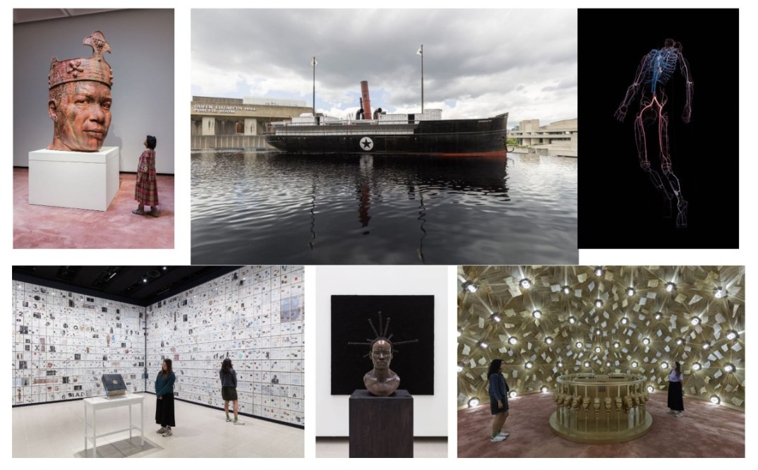 The importance of this sentiment is spelled out across the facade of the Hayward Gallery in a nine-metre-high neon work that declares: You Belong Here. Accompanying this work outside the gallery is a giant bronze head of 20th century Black nationalist Marcus Garvey, whose own ambitious projects were fueled, in no small part, by his desire to forge a collective sense of belonging for people of the African diaspora. Marked and weathered so as to resemble an ancient sculpture, Garvey’s head is presented as if a relic of a lost civilisation. On the Hayward’s flooded sculpture terrace, Strachan presents a large-scale sculpture of the S.S. Yarmouth, the flagship of the Black Star Line, the shipping company founded in 1919 by Jamaican social activist Marcus Garvey with the goal of facilitating trade and travel between the United States, the Caribbean and Africa.